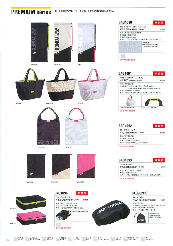 ヨネックスカタログ2010/66ページ・バッグ(ラケットケース・トートバッグ・ポータブルバッグ・シューズケースランドリーポーチ)